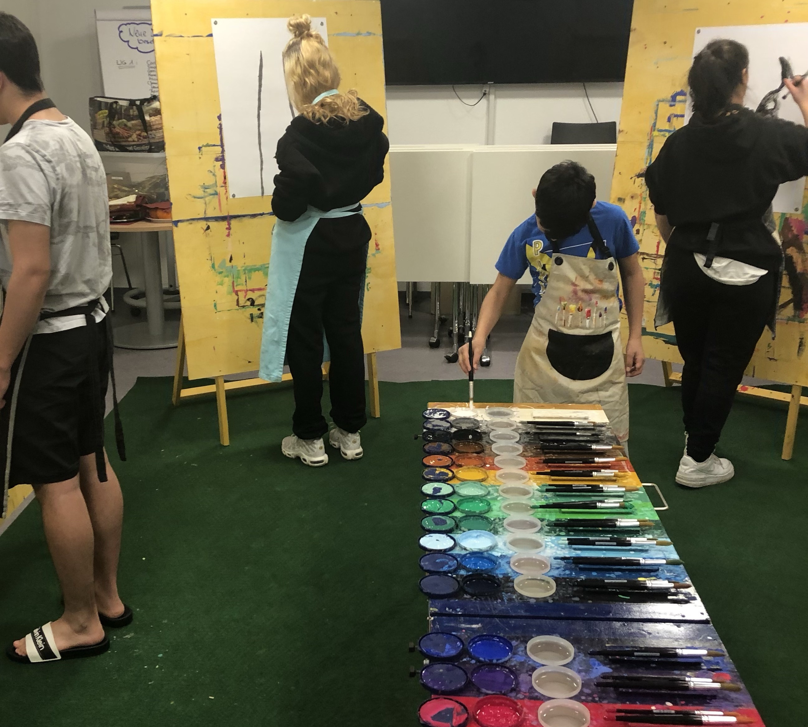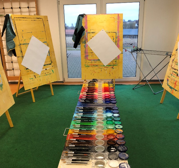 Ich bringe alles mit, was man für die Durchführung des Projektes braucht, und schaffe eine gute Umgebung für die Arbeit in Ihrem Raum: sechs große Malwände und 24 Farben auf dem Paletten-Tisch, großformatiges Papier und Bodenschutzbeläge, um den Boden Ihres Raumes sauber zu halten.